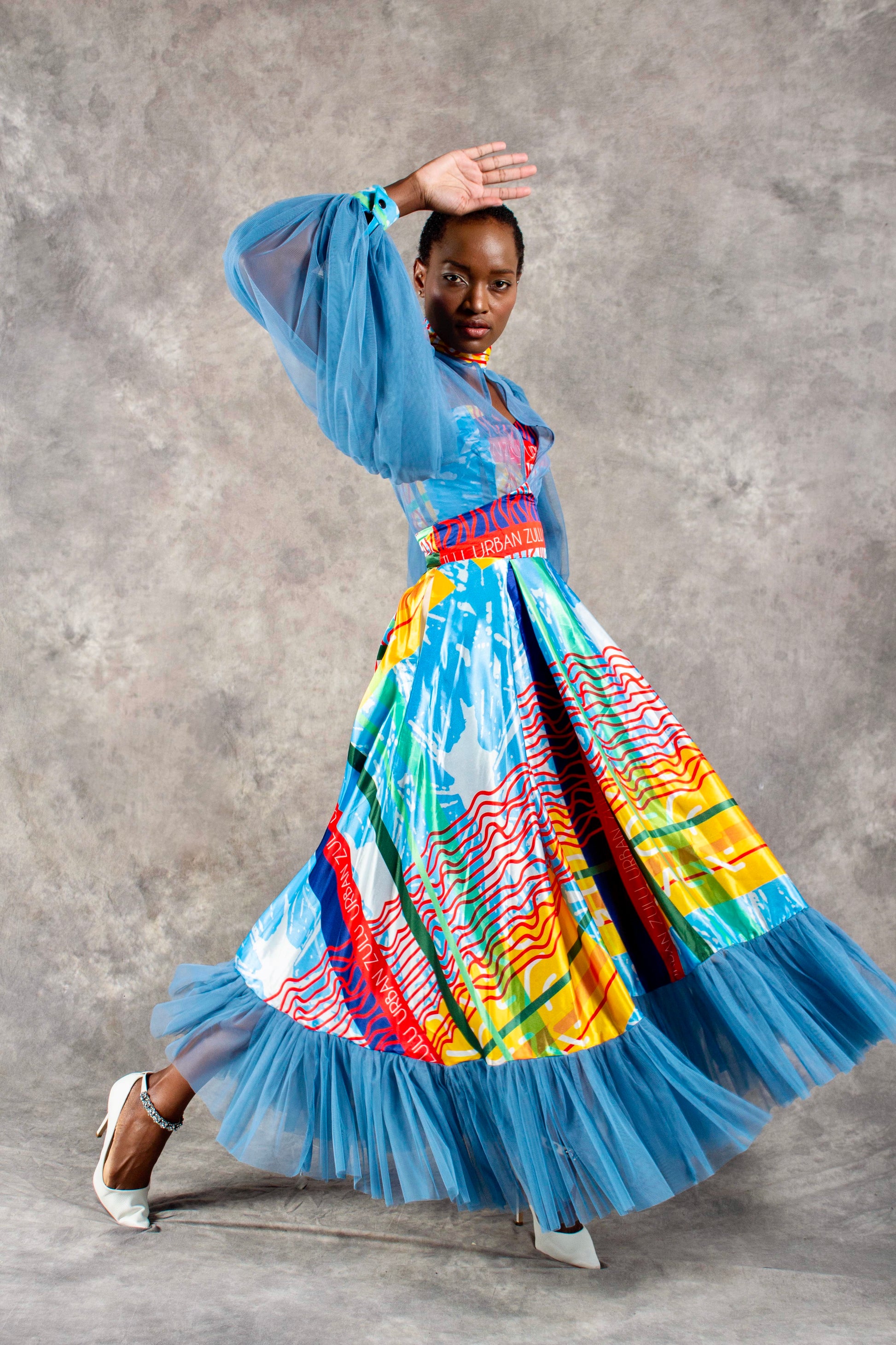 Hlaza cut , inside corset boob tube top of the dress with Medhy cover and dramatic mesh sleeves and satin and cuffs collar , the skirt part is also satin with a bottom mesh gathering