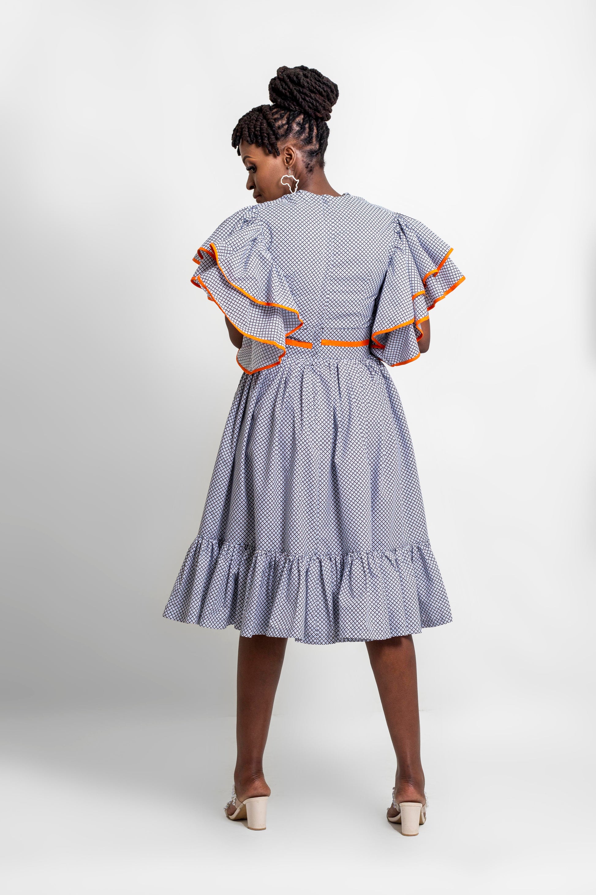 The Meta dress in a blue and white dotted dress with red trims around the waist and seams of the butterfly sleeves . With frills at the bottom of the skirt , A beautiful item to add your wardrobe this summer .