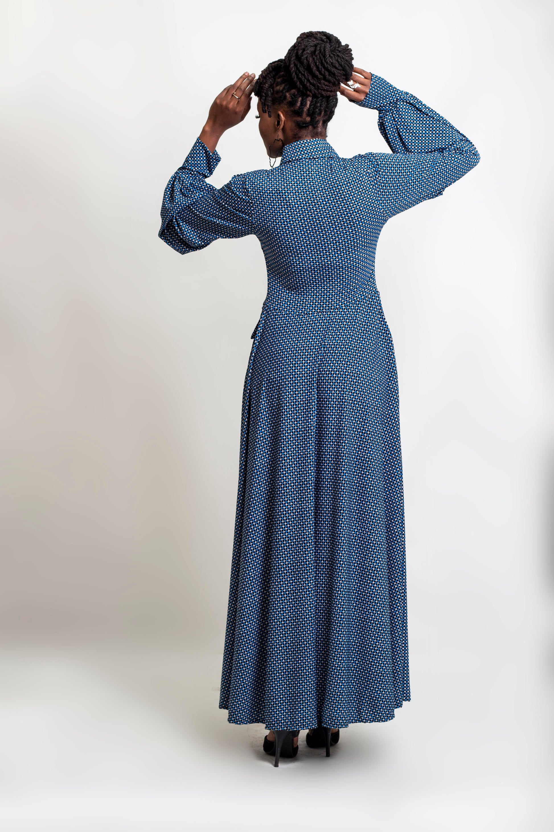 Maxi dress in stretchy fabric with long sleeves with a shirt collar